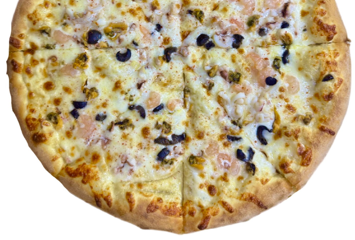 Креветки, мидии, осьминог, кальмар, маслины, лимон, моцарелла, соус